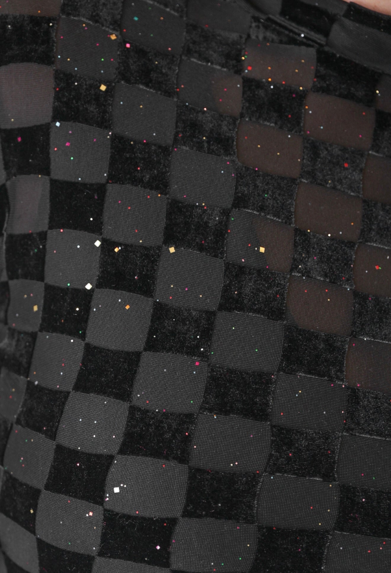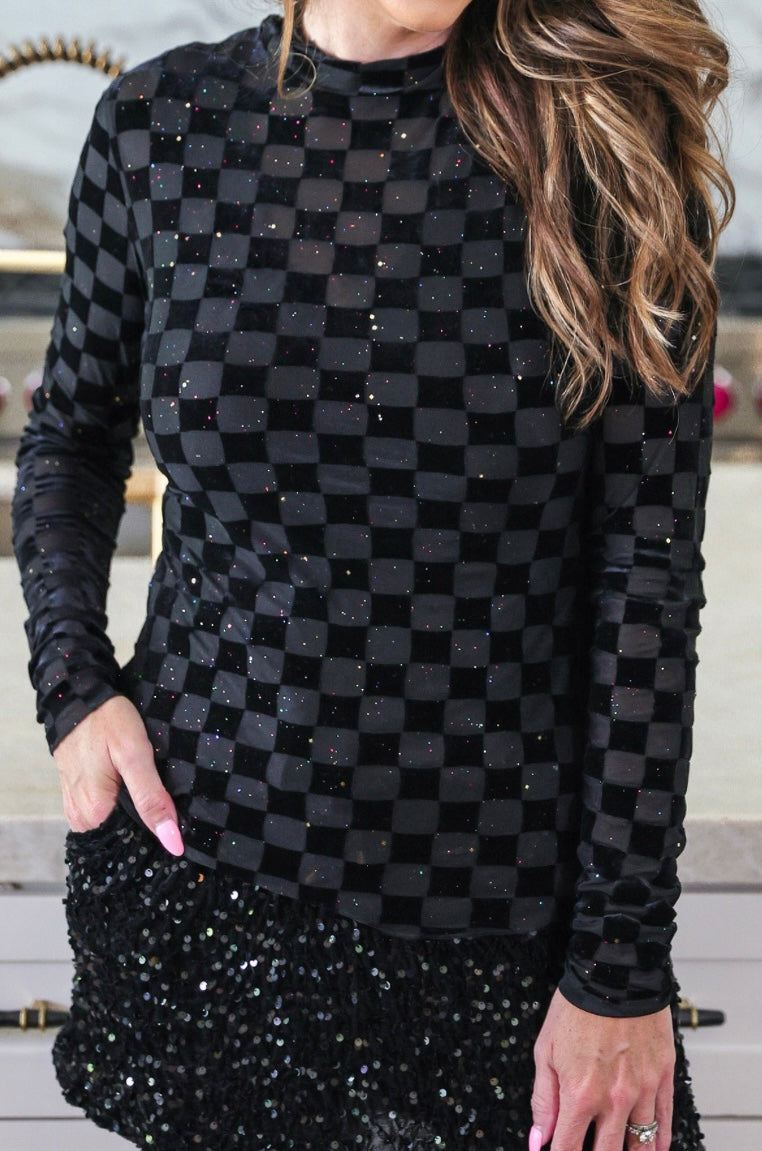 This exquisite black mesh top boasts a delicate velvet checkered pattern and confetti sparkles. It is ideal for festive holiday occasions but also makes a wonderful layering piece as well.